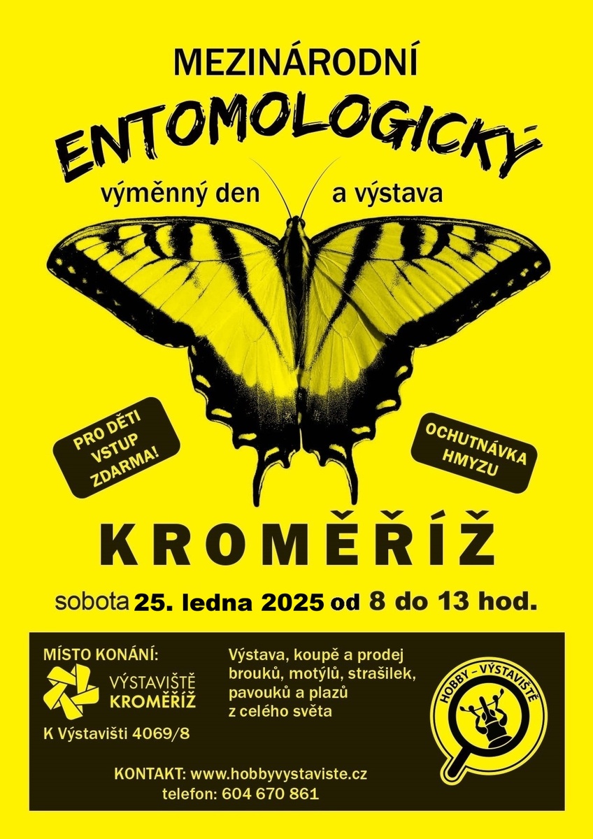Kroměříž - sobota 25.1. 2025 8.00 - 13.00 hod. Výstaviště Kroměříž, K Výstavišti 4069/8, Hala B. Mezinárodní setkání sběratelů a chovatelů brouků, motýlů a ostatních skupin hmyzu. Součástí je nákup, prodej entomologických potřeb, odborné literatury a ochutnávka hmyzu. Informace na mob.: +420 604 670 861,Ing. Dan Čagánek,e-mail: dan.caganek@tiscali.cz, www.hobbyvystaviste.cz, pozvánka |