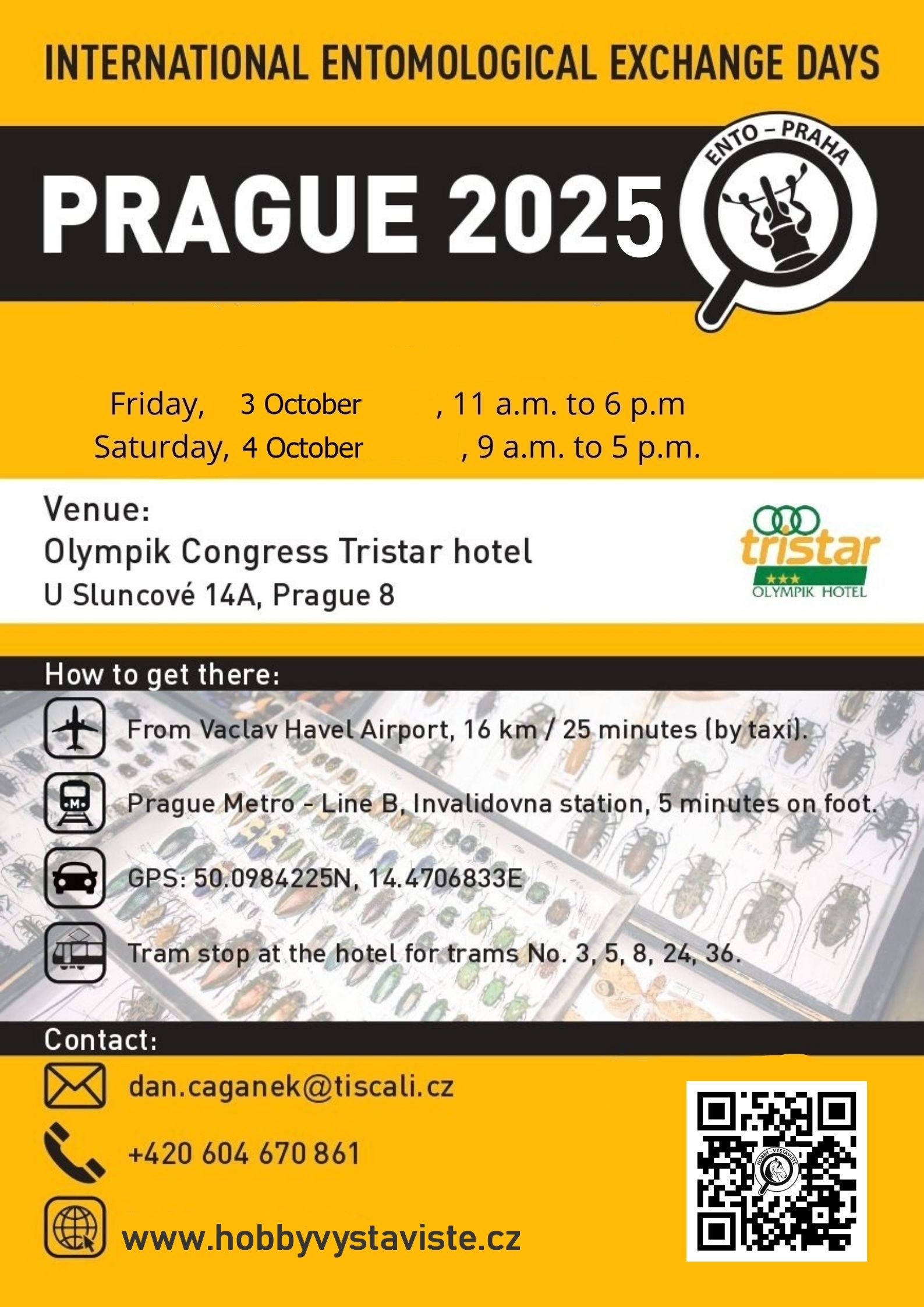 Praha Olympik - pátek 3.10.2025 11.00 -18.00, sobota 4. 10. 2025 9.00- 17.00 hod. Hotel Olympik Congress Tristar, U Sluncové 14A, Praha 8 - prodejní výstava brouků a motýlů. ENTOMOLOGICAL EXCHANGE DAYS AND EXHIBITION Informace : +420 604 670 861, Ing. Dan Čagánek, e-mail: dan.caganek@tiscali.cz, www.hobbyvystaviste.cz , pozvánka |